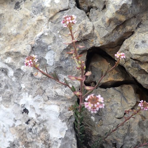 Aethionema saxatile Aethionéma des rochers Brassicaceae Petites fleurs roses, fruits arrondis à la base et échancrés au sommet.