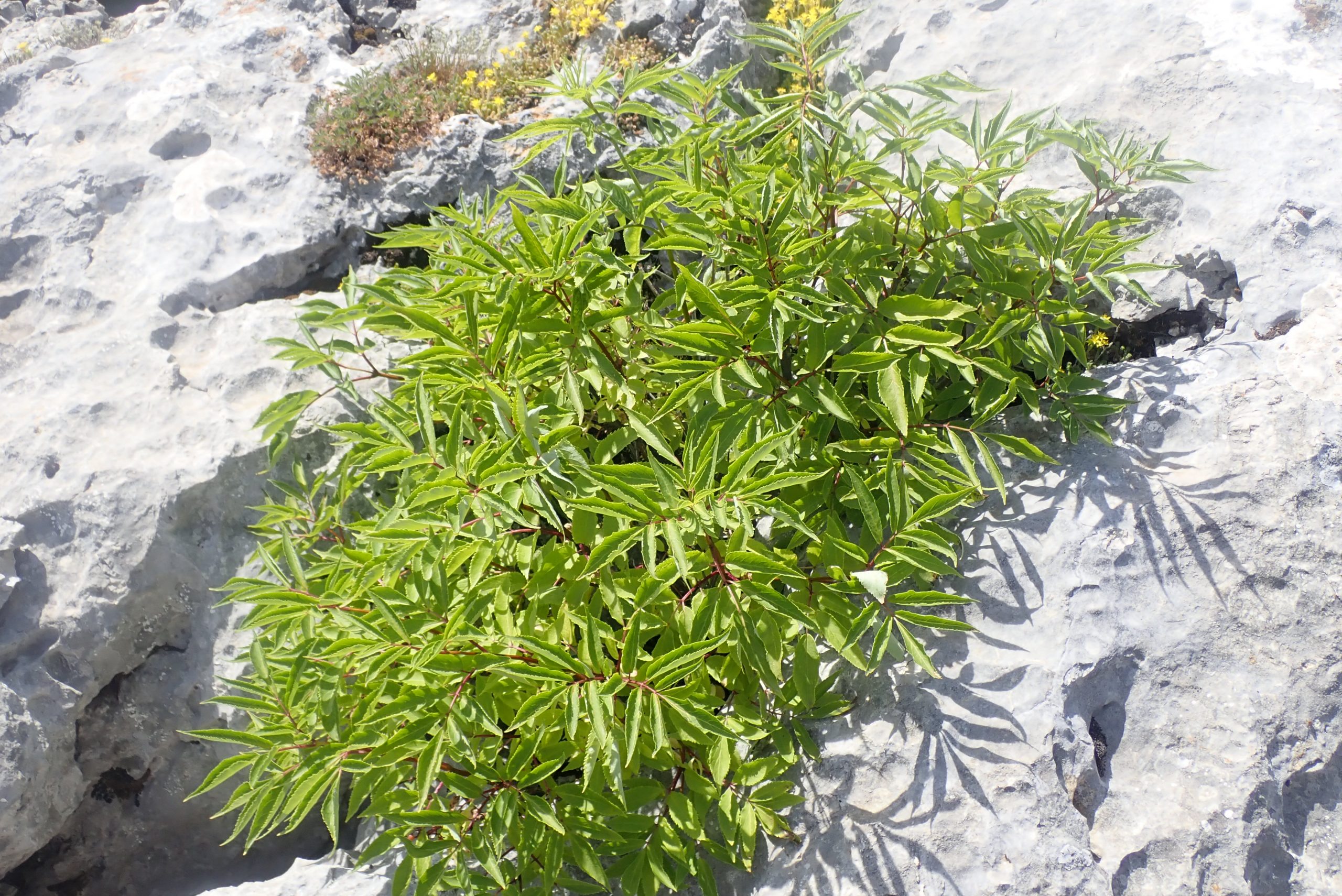 Sambucus racemosa Sureau des Alpes Adoxacées nain, sur une roche, fruits rouges