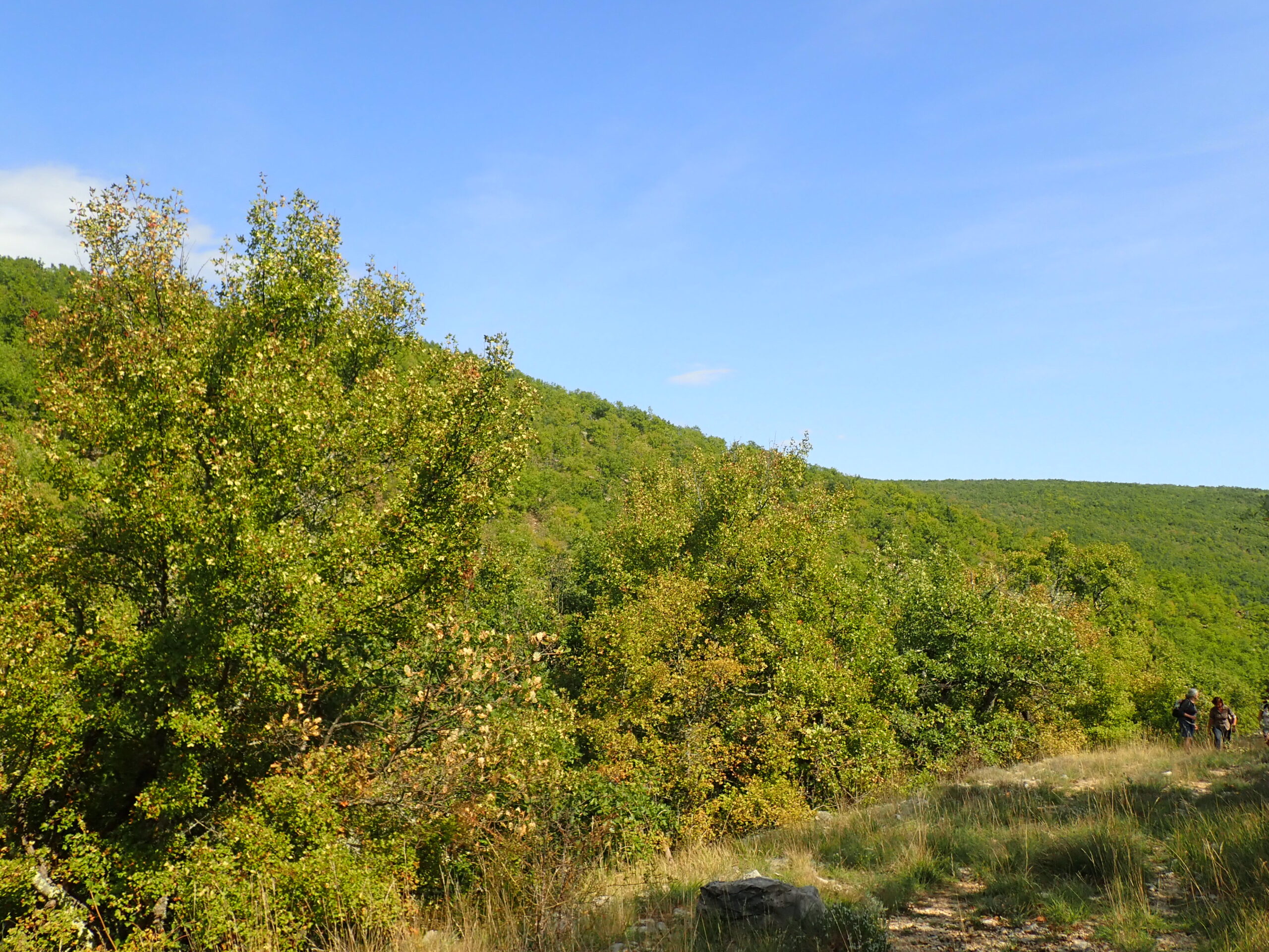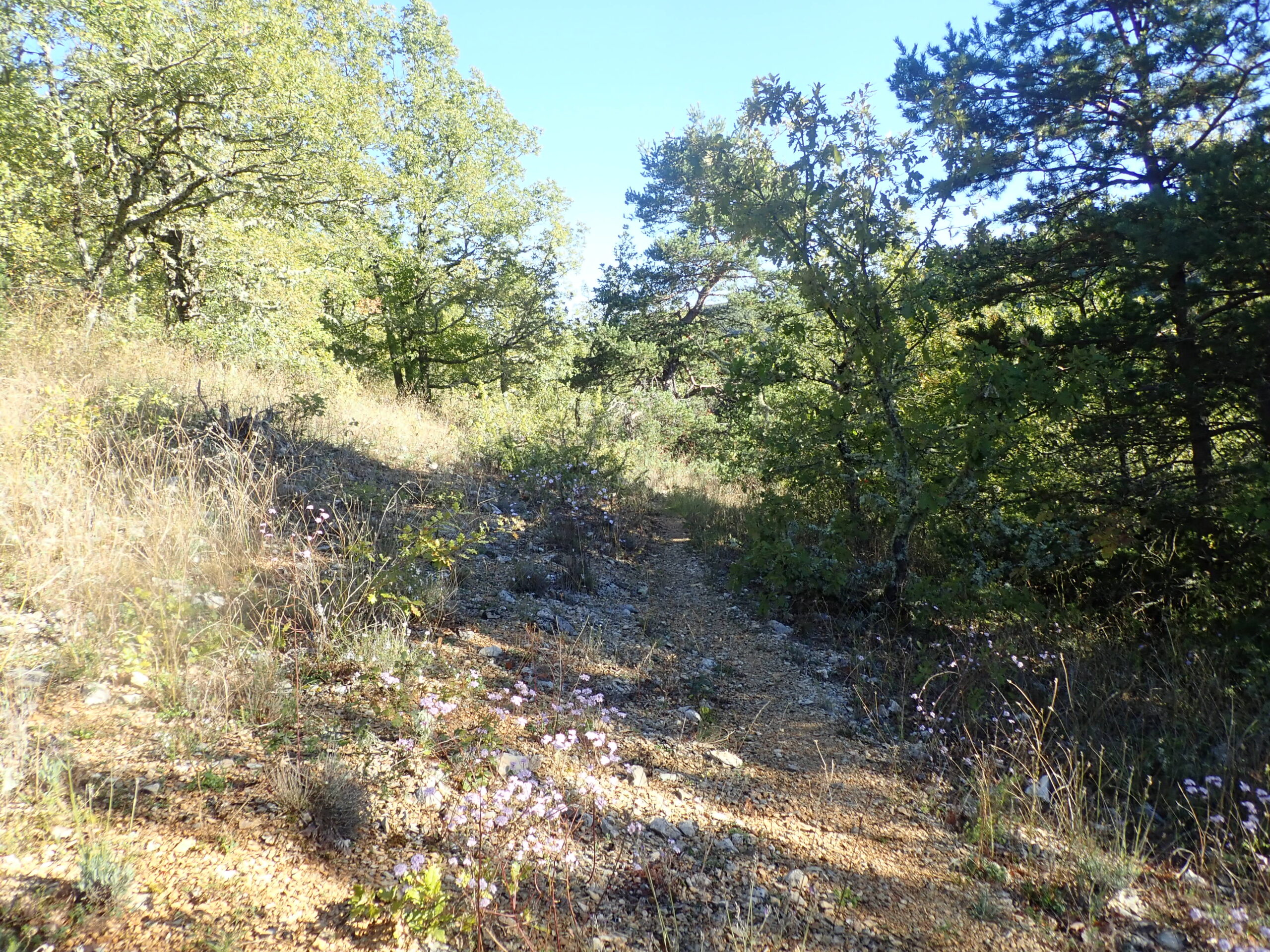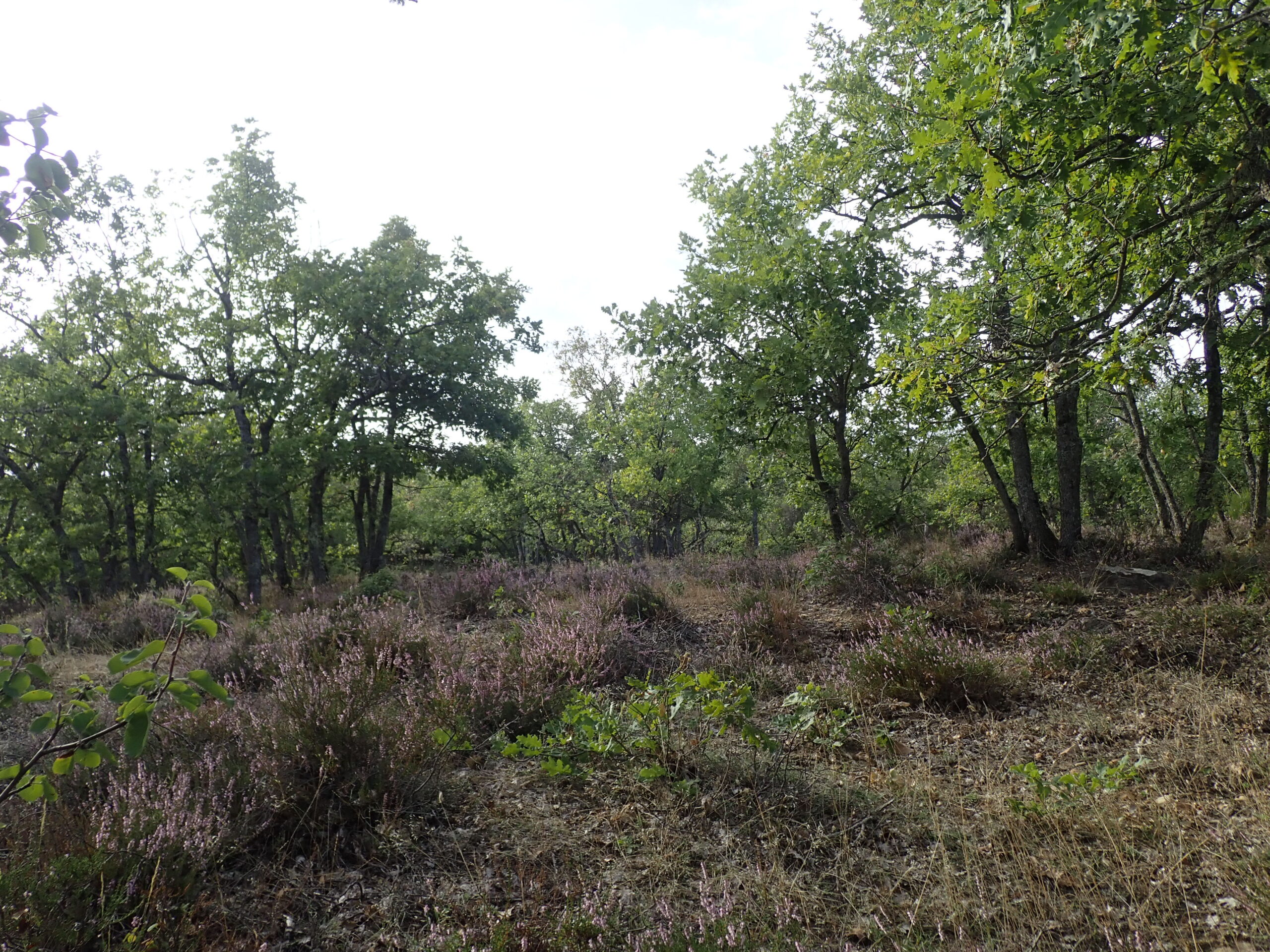 Nous avons alterné les milieux calcaires et acidophiles dans un milieu très sauvage, tellement sauvage que nous nous sommes un peu perdus au détour d’un chemin (pour mieux nous retrouver…. ) Nous avons traversé une belle chênaie pubescente-hêtraie. Nous sommes non loin de la Montagne de Lure que nous voyons parfois au détour d’un chemin. Ensuite nous entrons dans une belle hêtraie très sombre, pour finir sur les milieux acidophiles avec son cortège de plantes : Bruyères à balai, callunes, fougères, châtaignier, pins maritimes et même un chêne sessile (rare dans notre secteur). C’est la fin de l’été, nous avons vu nos premières colchiques et quelques rares champignons.