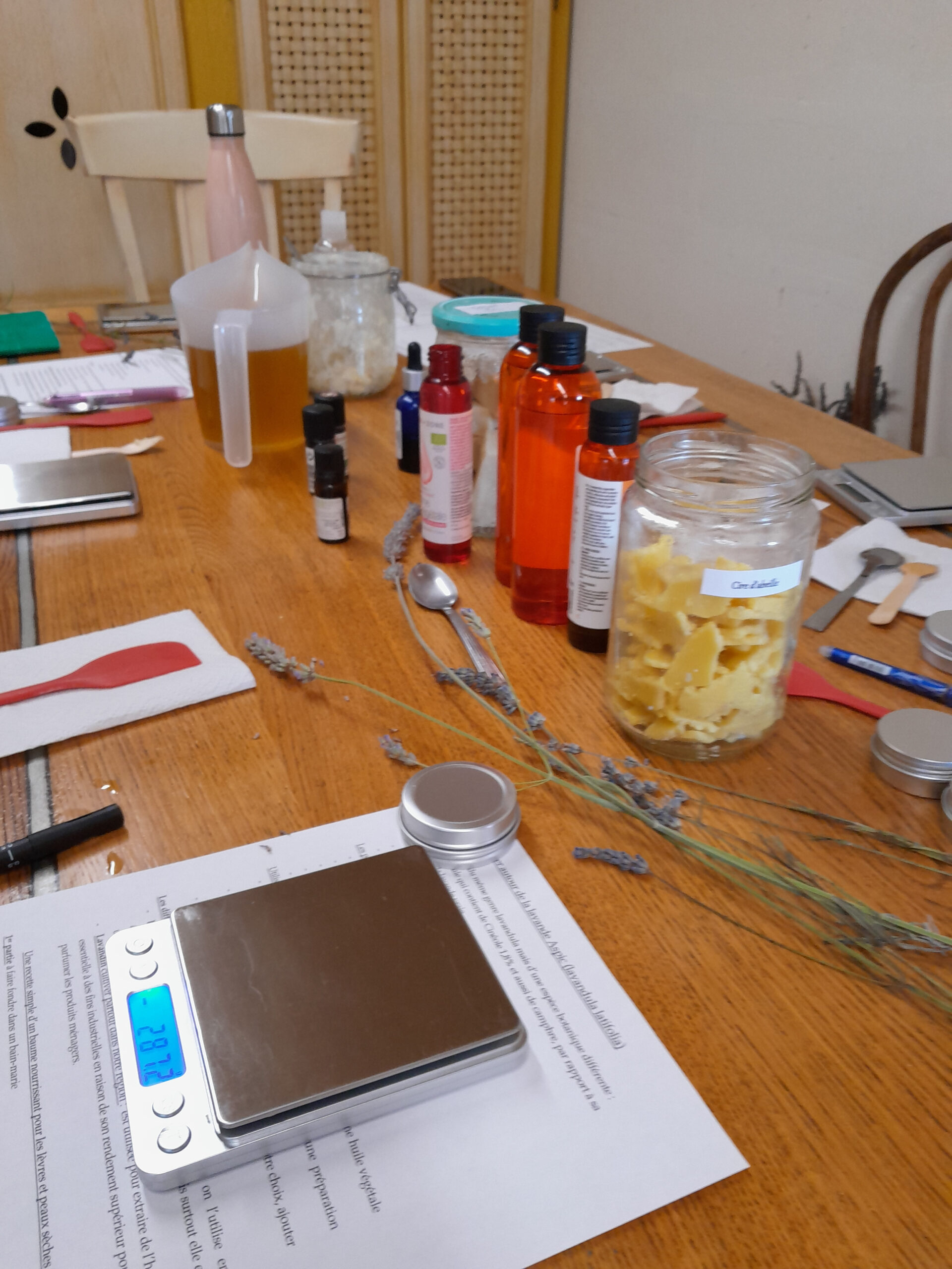 – Fabrication d’un baume de soin à la lavande (le macérat aura été fait à l’avance).