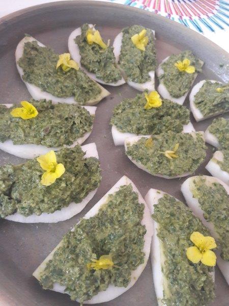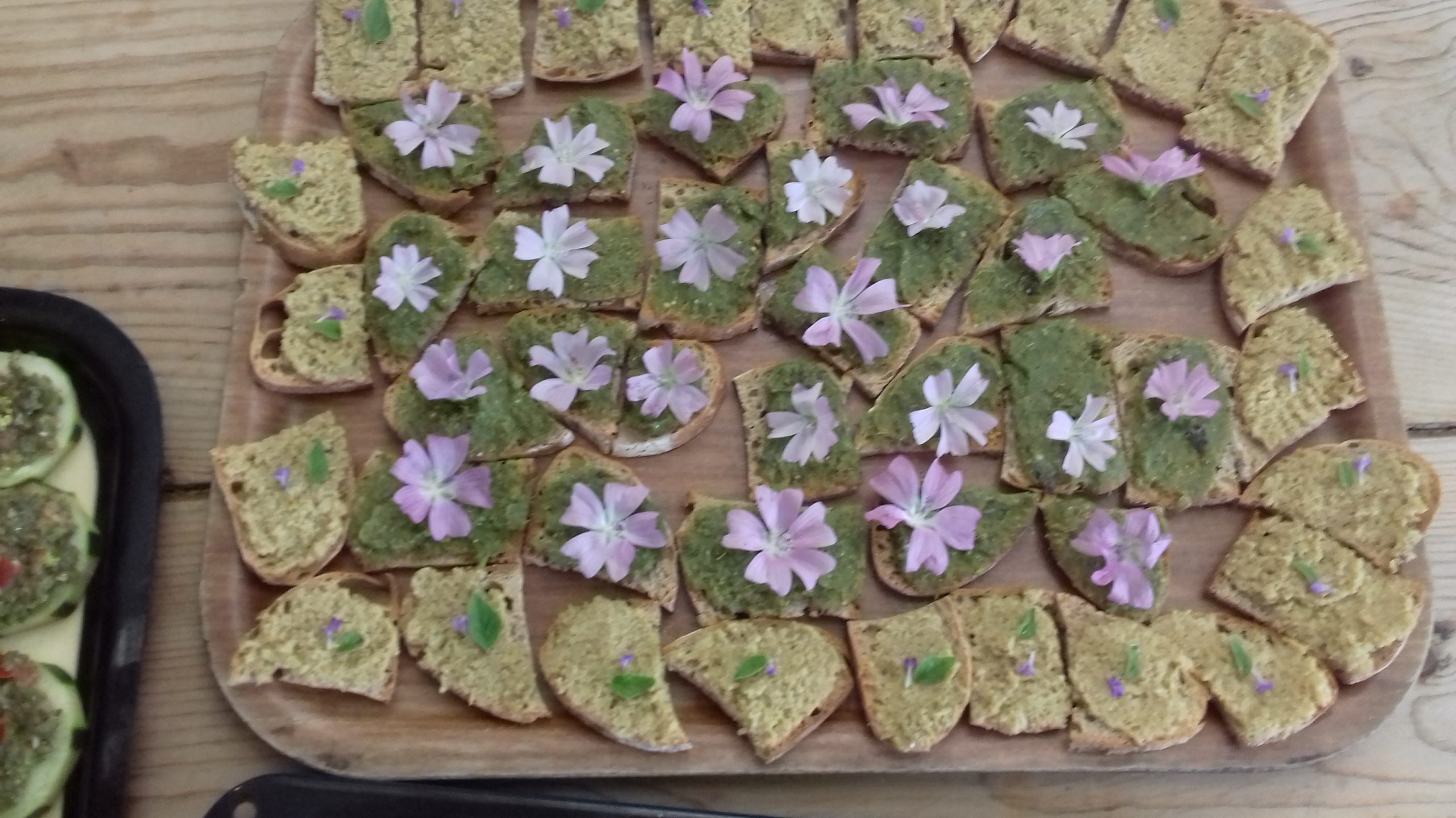 Temps de pause dans la matinée avec petit en-cas à base de plantes sauvages apportées par Frédérique.